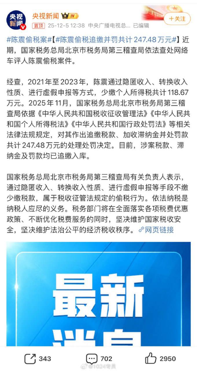 陈震 偷税 追缴 并罚 共计 247.48万元 #罚款
